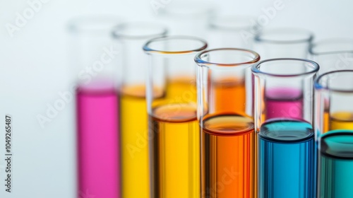 Laboratory glass test tubes containing multicolored liquid chemical compounds