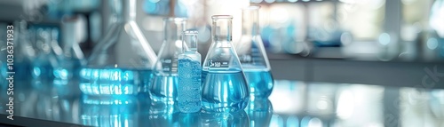 Laboratory glassware with blue liquid on a reflective surface.