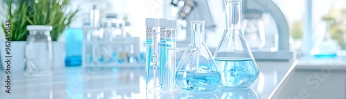 Laboratory Glassware with Blue Liquid, Scientific Research, Medical
