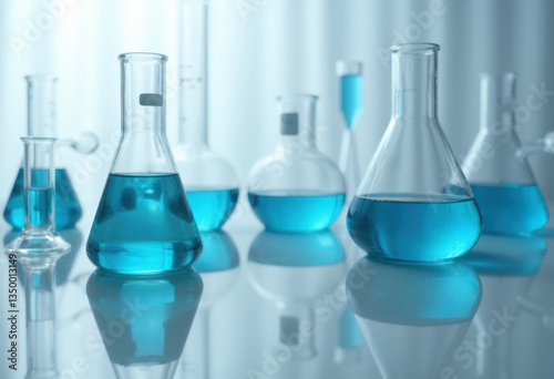 Laboratory glassware with blue liquids reflecting on a smooth surface