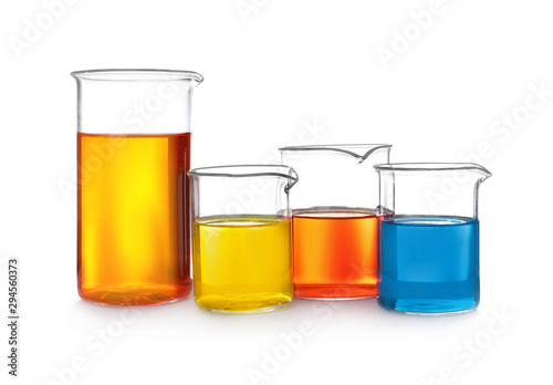 Laboratory glassware with color liquids on white background
