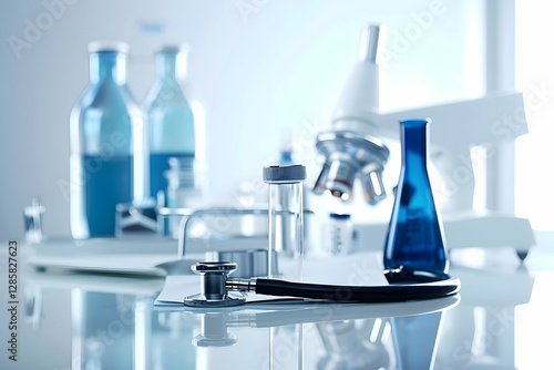 Laboratory scene featuring glassware and medical equipment, with a microscope and stethoscope in focus