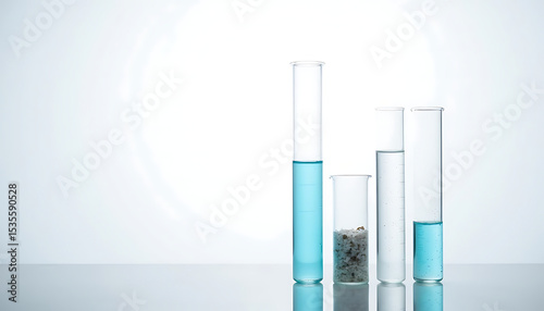 Laboratory test tubes with blue liquid and substances on reflective surface