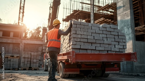 Laborer unloading heavy bricks from a truck at a construction site. Featuring teamwork and strength