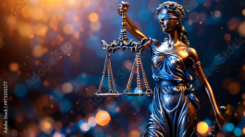 Lady Justice symbolizes fairness and impartiality, holding scales to represent balance in legal matters. This striking image captures her essence against vibrant, bokeh background
