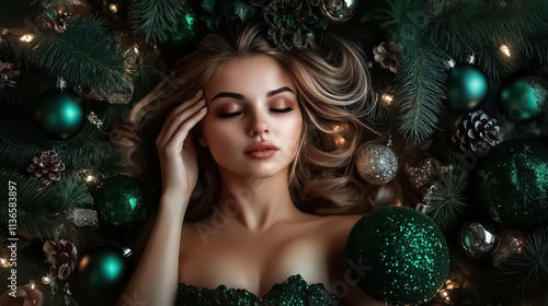 Lady lying surrounded by Christmas green baubles and elegant decor, luxurious holiday vibe