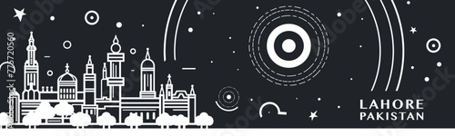 Lahore city vintage banner with abstract black and white cityscape and skyline. Retro vector horizontal illustration for Pakistan, Punjab