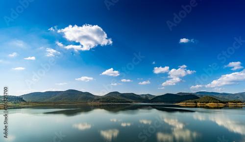 Lake with mountain and blue sky background