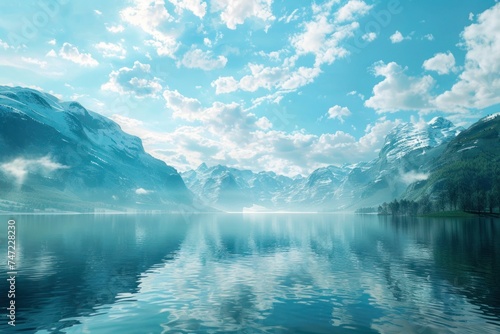 Landscape featuring a tranquil lake nestled among majestic mountains.