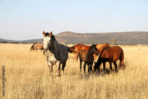 Landscape photo of horses in a winter field in the Northwest of South Africa.