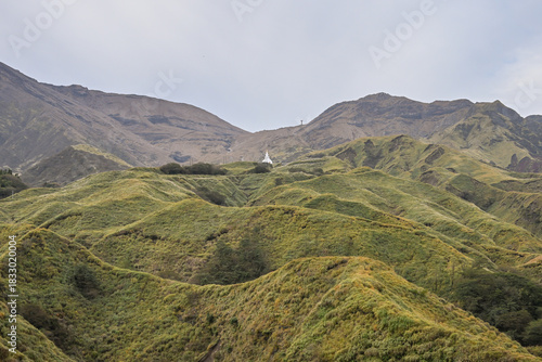 Landscape View Of Aso City And Mountains With Silvergrass On The Trail To Peak Nakadake, Aso Kuju National Park, Kumamoto, Kyushu, Japan