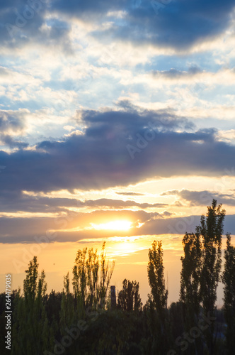 Landscape with dramatic light - beautiful golden sunset with saturated sky and clouds.