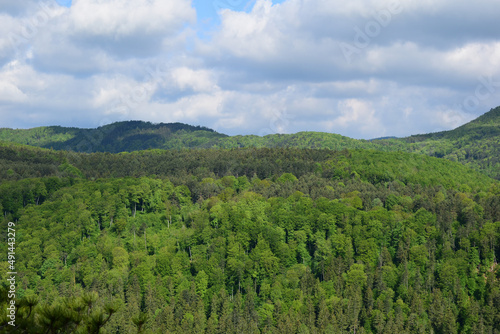 Landschaft mit hellgrünen, frischen Bäumen im Mai mit Wolken und Sonne