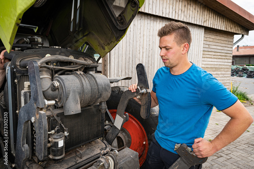 Landwirtschaft und Landtechnik, junger Landwirt vor geöffneter Motorhaube eines Traktors
