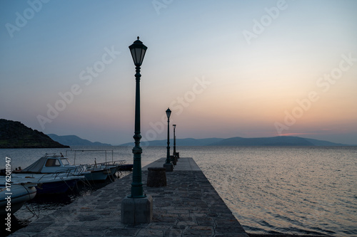 Lanterns on a pier with boats, by the sea after sunset