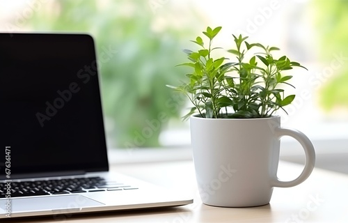 laptop, coffee cup and plant on white wooden table, office work concept
