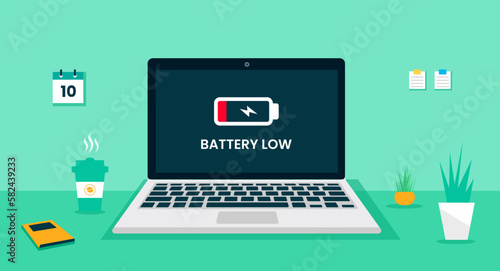 Laptop computer desk battery low icon on screen concept, vector flat design illustration. laptop desk vector flat design. computer desk vector flat design. computer desk working space.