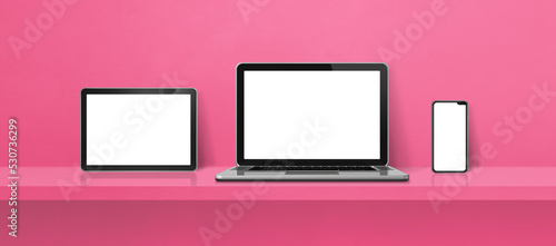 Laptop, mobile phone and digital tablet pc on pink wall shelf. Banner background