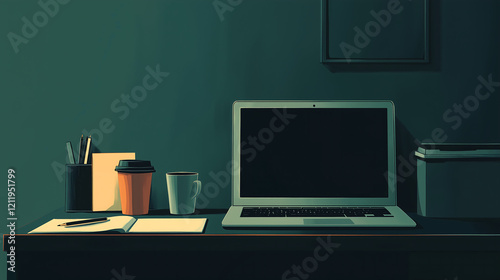 laptop on a desk with a coffee cup, notepad, and pen, against dark green background, with a simple design and flat colors