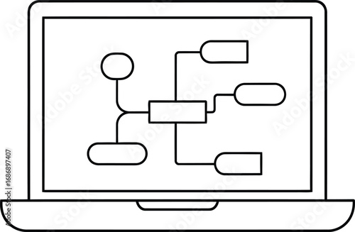 Laptop screen displays a flow chart diagram with connected shapes and lines
