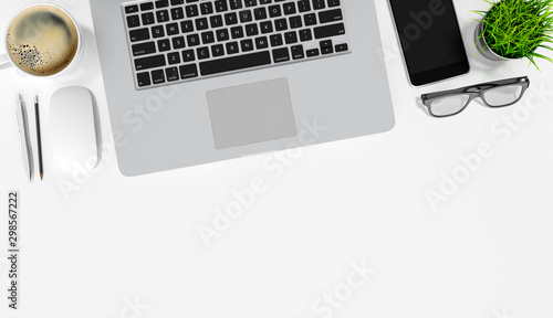 Laptop, smartphone, coffee cup, glasses, pen and pencil on white office desk table, top view, copy space, 3d rendering