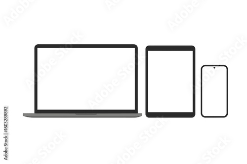 Laptop, tablet and smartphone mockup set. Digital devices with blank white screen for responsive web design presentation. Front view of electronic gadgets template isolated.