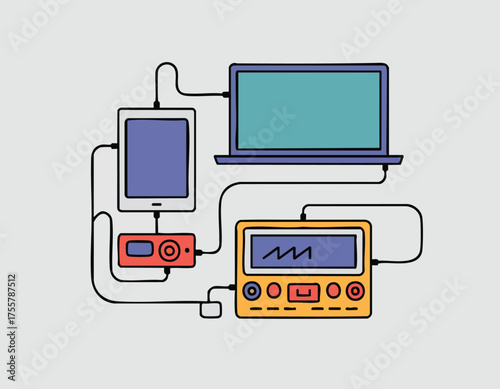 Laptop tablet red device and yellow machine connected with black cables