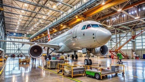 Large commercial aircraft undergoing maintenance inspection inside vast aviation hangar with engine and fuselage repair work in progress.