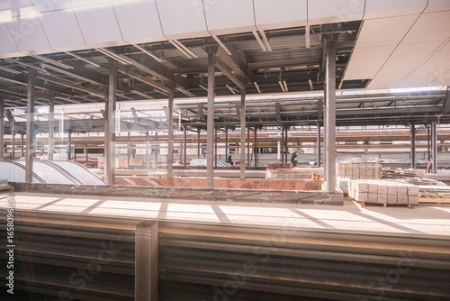 Large construction site for a modern building with steel beams and building materials. Development and progress concept.