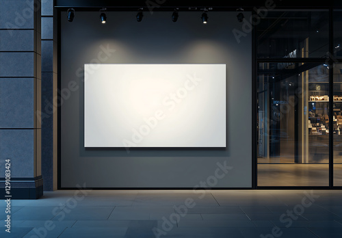 Large empty poster frame mockup illuminated on a modern dark wall with spotlights, perfect for branding and advertising