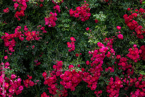 Large flowering rose bush. Hedge. Space for text. Background.
