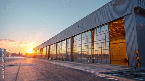 Large industrial hangar building Early morning scene with soft natural lighting