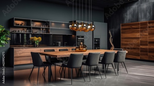 Large kitchen room with modern interior design with wood table and chairs at home