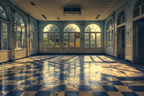 Large Room With Checkered Floor and Windows