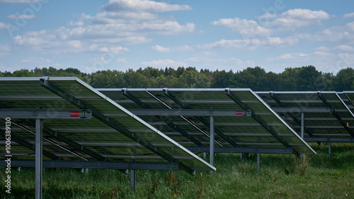 Large solar energy farm wit photovoltaic panels in rows seen from behind, Drenthe, Netherlands