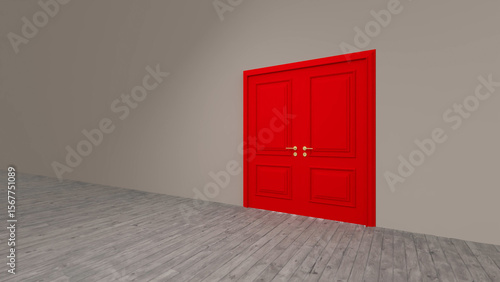 Large, vibrant red double door stands prominently in a minimalist gray room with a wooden floor, symbolizing opportunity, transition, and the potential for new beginnings