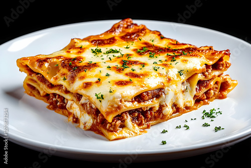 Lasagna on plate, food photography for Italian restaurant menu, against dark background
