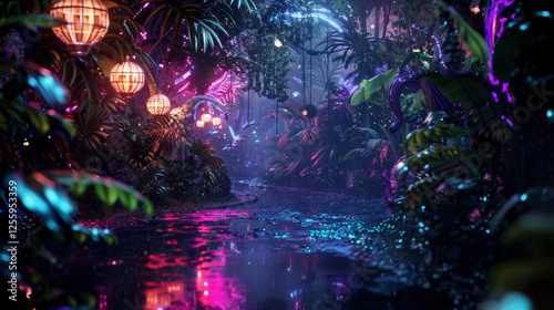 Late Night Neon Jungle Photography with Vibrant Lights and Exotic Flora