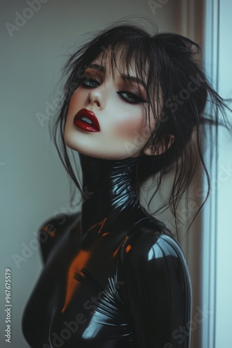 Latex fashion style female portrait, fashion and make-up shoot. Latex bodysuit, catsuit. Goth, Emo, New Wave, Dark style fashion. Dark smokey make-up, red lipstick. Dramatic. Elegant.