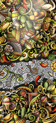 Latin America hand drawn doodle banner. Cartoon detailed flyer. Latin American identity with objects and symbols. Latino illustrations. Color vector background