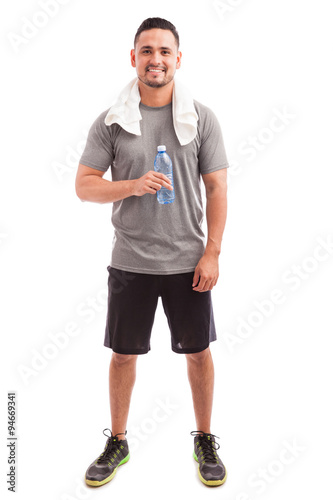Latin athlete drinking water and resting