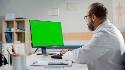 Latin Doctor's Office: Experienced Physician Sitting at His Desk Working on Green Chroma Key Screen Personal Computer. Medical Health Care Specialist Checking Analysis Test Results.