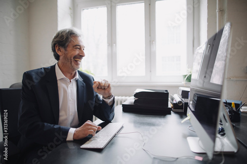 Laughing senior businessman working at desk in office