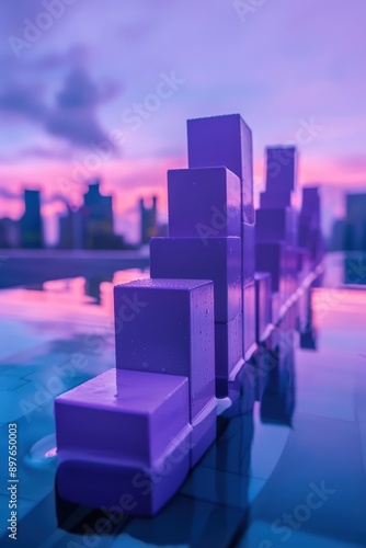 Lavender blocks ascend gracefully, reflecting calm and steady market progress on a twilight background.