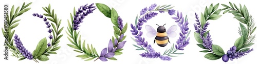 Lavender wreaths and bee illustration, white isolate background.