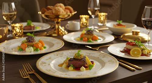 Lavish Dinner Setting Featuring Gold Accented Tableware And Gourmet Meals