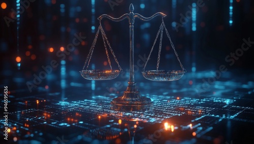 Law scales on background of data center. Digital law concept of duality of Judiciary, Jurisprudence and Justice and data in the modern world. Copy space.