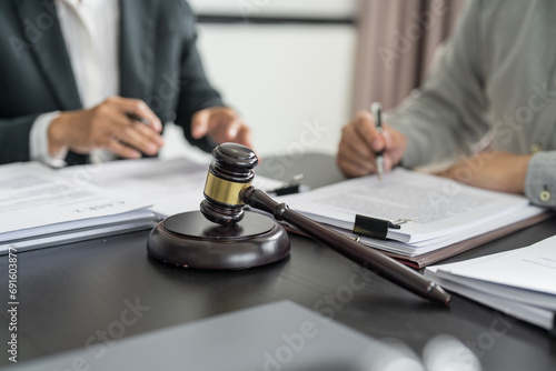 Lawyer Legal counsel presents to the client a signed contract with gavel and legal law. justice and lawyer Business partnership meeting concept