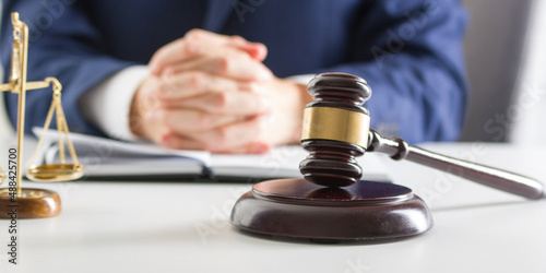 Lawyer working with contract papers and wooden gavel on tabel in courtroom. justice and law ,attorney, court judge concept.
