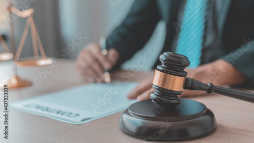 Lawyers or judges sign documents in accordance with legal and fair terms of agreement, Legal Ethics and Integrity, scales of justice, law hammer, Litigation and legal services.